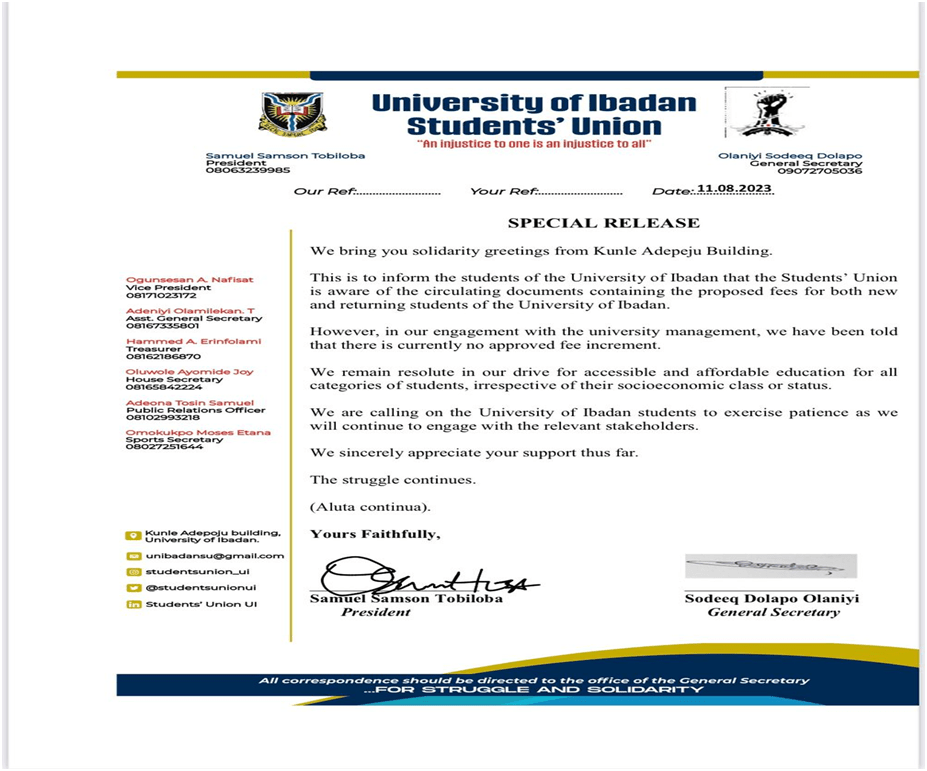 Then the payment of hostel accommodation commenced and confirmed the fears of returning students paying forty-five thousand naira (#45000) as opposed to the former thirty thousand naira (#30000), while new entry students paid sixty thousand naira (#60000). After addressing students on the proposed fee on August 11, 2023, the UI Students’ Union indulged the students to exercise patience and said that the school management had yet to finalize the fees.