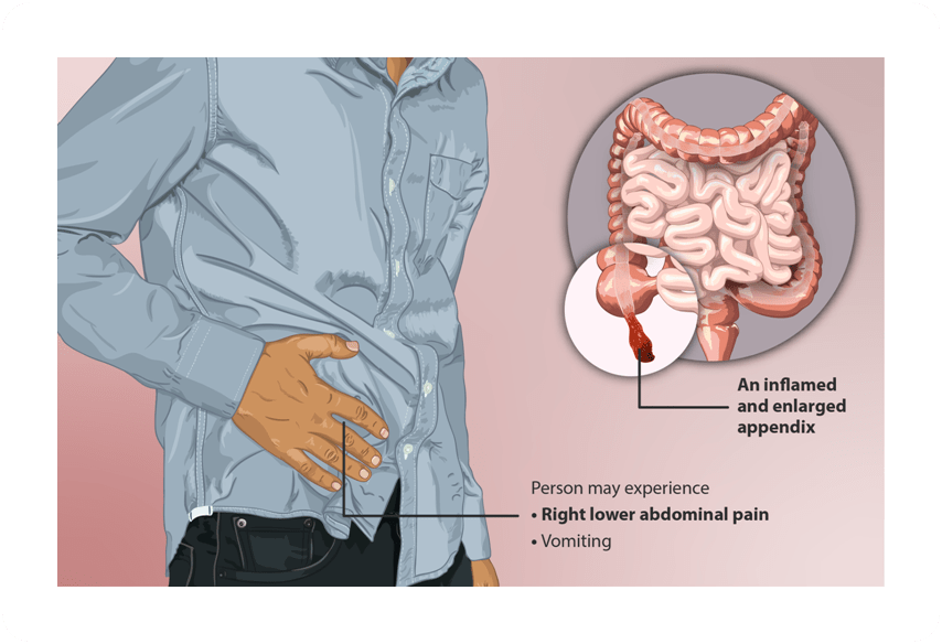 One common sign of appendicitis pain is a slight cramping sensation in the upper abdomen or belly button area, which later spreads to the lower right abdomen. This pain often gets worse when you move or cough and is severe and different from other abdominal pain you’ve experienced. Other symptoms may include loss of appetite, tenderness at the abdomen region as the abdomen is sensitive, mild fever, and sometimes abdominal swelling. Despite appendicitis developing due to clogging and obstruction of the appendix, the exact cause of appendicitis is unknown. Many things like a buildup of hardened stool, intestinal worms, enlarged lymphoid follicles could potentially block the appendix. The food one eats could also cause appendicitis when undigested food particles get stuck in the opening to the appendix which leads to inflammation.