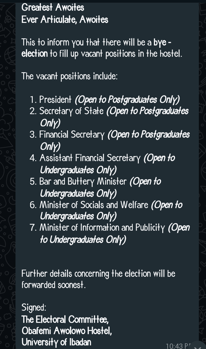 The Electoral Committee of Obafemi Awolowo Hall, University of Ibadan, has announced a bye-election to fill vacant leadership positions. This follows the removal of the previous president and the appointment of a new President, which sparked debates about democratic principles.