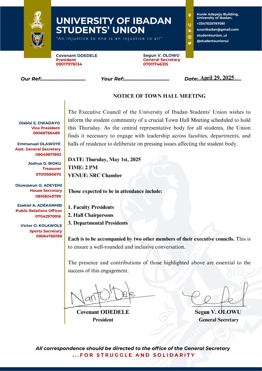 The Executive Council of the University of Ibadan Students’ Union has announced a crucial Town Hall Meeting scheduled to hold on Thursday, May 1st, 2025. The meeting is set to take place at 2 PM in the SRC Chamber.