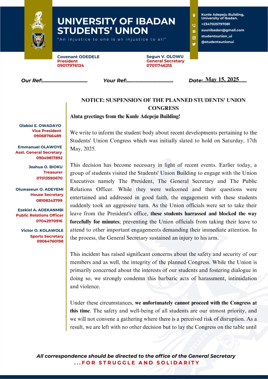 The University of Ibadan Students’ Union has announced the suspension of the planned Congress scheduled for Saturday, May 17, 2025, following a confrontation with a group of students.